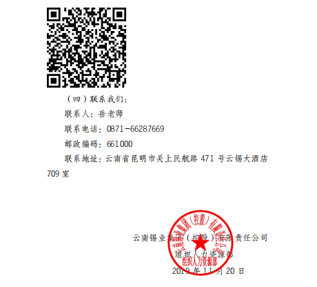 時間:2019-11-22 09:35 來源:云南錫業(yè)集團(tuán)(控股)有限責(zé)任公 微信公眾號:yn2553 QQ公眾號:800061629