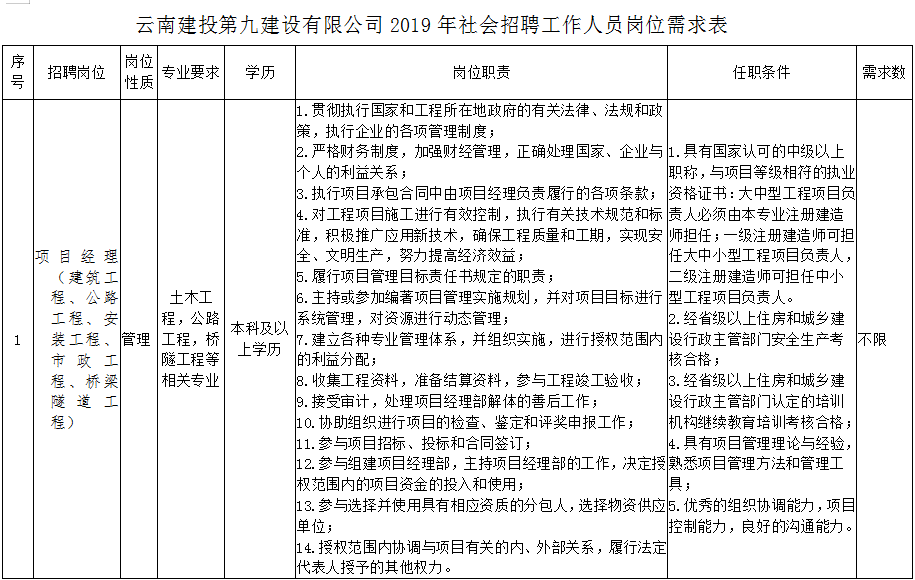 云南建投第九建設(shè)有限公司2019年社會招聘簡章